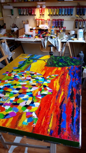 En genieten is wat ik doe. Abstract, want daar kun je zoveel mee: niks moet maar bijna alles mag (blauwe bomen, groene lucht). Figuratief, omdat ik niet hou van alleen maar klodders verf op een doek waarna iemand na urenlang turen zegt "ik zie......., ik zie daar een olifant in". Abstract figuratief in acryl (en alles wat zich daarmee mengen laat) lijkt dus lekker ongebonden. Binnenkomende ideeën zou je dus in een mum moeten kunnen verwezelijken. Dat kan en mag zo zijn.