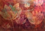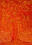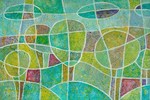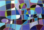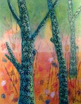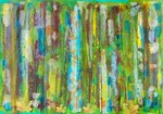 2013Spel met lijnen en vormen. Heuvellandschap? Lucht? Bomen? Ja, waarom niet. Laten we er een harmonisch geheel van maken, de kleuren vormen de schakel tussen wat is en niet is. Ziedaar, een bos.